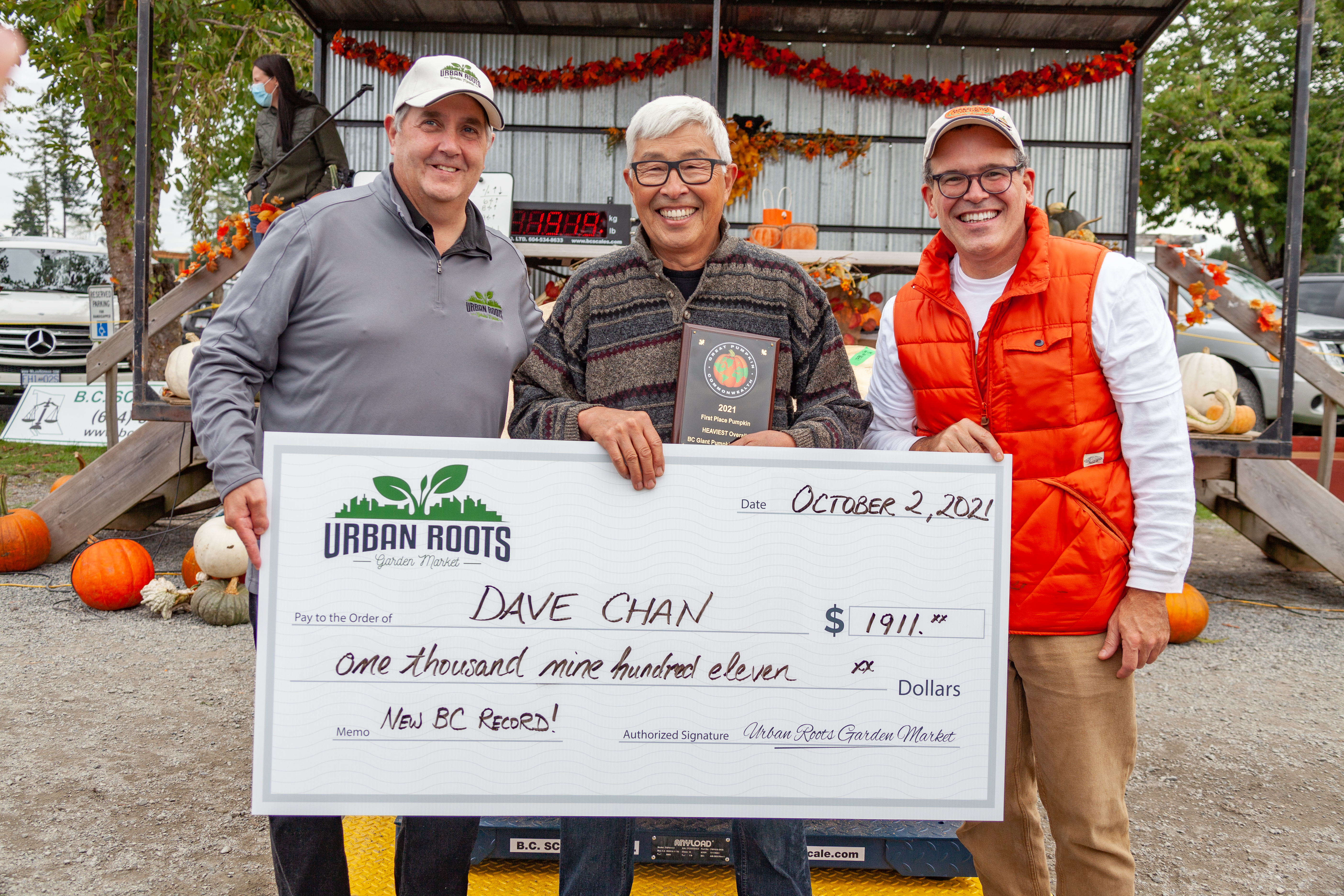 Photo of Dave Chan accepting his GIANT cheque from our 1st Prize Sponsor Urban Roots Garden Markets – $1 PER POUND!!! $1,911 DOLLARS!!! Thank you, thank you, thank you, Urban Roots!!!