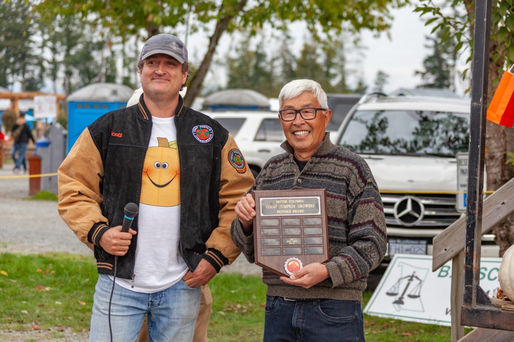 Photo of Scott Carley, previous BC Record holder since 2017, presenting Dave Chan, our NEW BC RECORD holder in 2021 with British Columbia’s GIANT PUMPKIN GROWERS Province Record plaque.